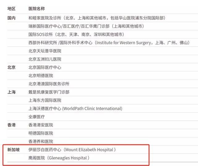 中国AIA提供的高端医疗保险,也包括新加坡的伊丽莎白医院。