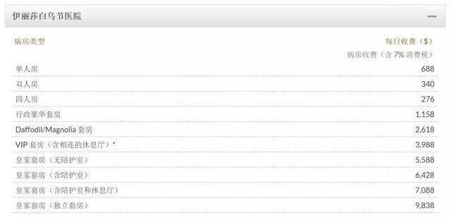 住院治疗的费用集中在病房费,医生诊疗费,手术费这几大板块。就住院治疗方面,不同人对病房的需求不同,费用就不同,以伊丽莎白为例:
