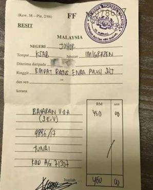 办好手续我拿回护照,然后我们驾车到“Touch n Go”付款。因为付款机器在左边,我就先协助我朋友完成付款手续。离开以后,我才检查了我们护照上的章,我突然发现我朋友的护照盖章了,而我的没盖章!