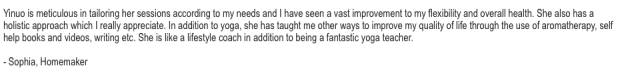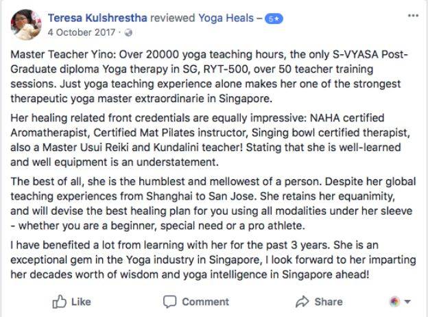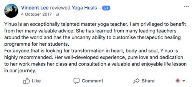 随着体式的精进,依诺也慢慢走上能量疗法和灵修的道路。她自2009年成为臼井灵气和昆达尼灵气大师级导师之后,这些年一直钻研各种能量疗法,目前她是新加坡唯一一位经认证的瑜伽手印疗愈师,第一位获得美国国家芳香与整体治疗协会(NAHA)临床芳疗认证的瑜伽老师,同时也在声音疗法,情绪释放疗法(EFT),日本直传灵气,Psych-K疗法,萨满疗愈等能量疗法中颇有造诣。