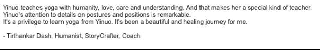 依诺在16年前开始练习瑜伽,那时的她跟大部分瑜伽爱好者一样,以不断精进自己的体式为目标,从哈达瑜伽(Hatha Yoga)练起,到后来的阿斯汤加瑜伽(Ashtanga Yoga)一级和二级序列,希瓦南达瑜伽(Sivananda Yoga),阴瑜伽(Yin Yoga),昆达里尼瑜伽(Kundalini Yoga),艾扬格瑜伽(Iyengar Yoga)等,依诺不断的挑战和超越身体的极限,虚心跟随各个瑜伽流派的老师学习。