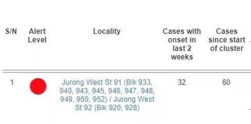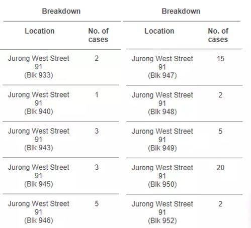病例主要集中在裕廊西91街(大牌933号,940号,943号,945号,946号,947号,948号,949号,950号,952号)和92街(大牌920号,928号)。