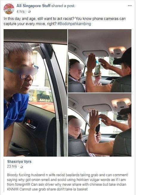 新加坡一对华族夫妻召来GrabShare,却在上车时向司机投诉,车内有另一名印度族女搭客身上发出“洋葱味”;还以福建粗口辱骂,结果车上的印度族乘客看在眼里、听在耳里,大感难受。