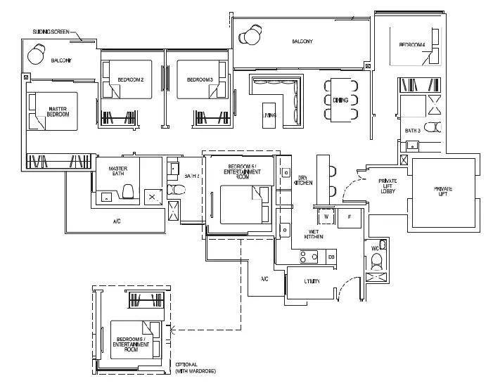 下图的五卧+工人房户型,私人电梯入户,厨房干湿分区,面积135平米(1453平方尺),3楼售价208万4千,扣掉三万新币折扣价钱205万4千。