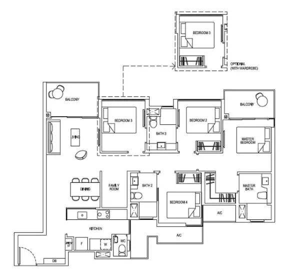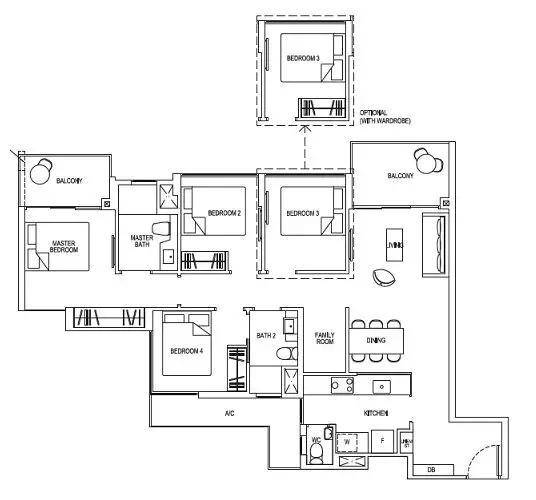 下图的优质四卧户型,四室一厅四卫+家庭室(可用作书房或工人房),主卧比较大,面积115平米(1238平方尺),2楼售价187万8千,扣掉三万新币折扣价钱184万8千。
