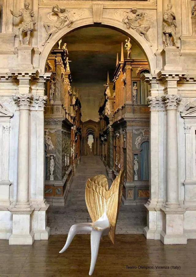 每一把椅子都有两种颜色,象征着艺术品 的双重灵魂,人类和超自然:座位被涂成彩色亮漆色,而羽翼则为金色或银色。