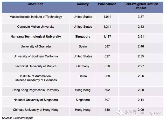 (南洋理工大学在人工智能(AI)引文影响力方面排世界第三位。)