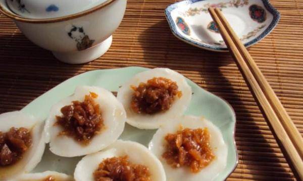 水粿是一样非常简单的食物,用米粉和水蒸成的糕点,吃起来Q又带有咬劲,水稞上也会淋上用葱、虾米、菜圃熬煮而成,特制的菜圃辣酱,又辣又咸,真的非常好吃!