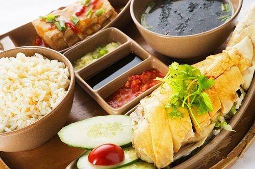 鲜美嫩滑多汁的白斩鸡搭配油光黄澄香鸡饭,配以鸡汤、切片的黄瓜和特制辣椒酱及姜蓉一起食用,简单美味,妙不可言。