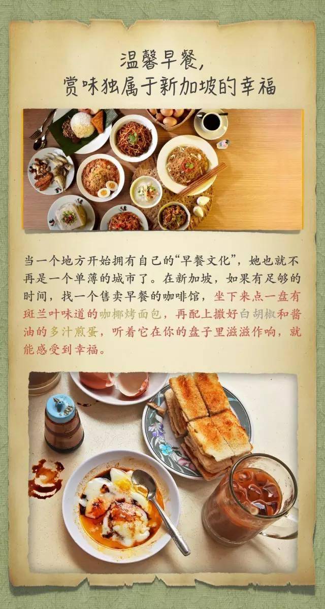 广告在新加坡,如果有足够的时间,找一个售卖早餐的咖啡馆,坐下来点一盘有斑兰叶味道的咖椰烤面包,再配上撒好白胡椒和酱油的多汁煎蛋,听着它在你的盘子里滋滋作响,就能感受到幸福。