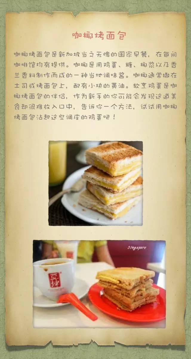 我喜欢以涂抹了咖椰和黄油的吐司开始一天的美好时光,尤其是Kaya咖椰吐司,这个新加坡当之无愧的国民早餐。用鸡蛋、糖、椰浆以及香兰香料制作而成的咖椰抹在烤的吐司片上,配上小块的黄油,同时搭配着吃还有仅仅才3分熟的养生蛋,热饮是咖啡或拉茶的咖椰。纯咖啡叫咖啡乌,加糖加奶叫咖啡丝。如果您不喝咖啡,可以点一杯奶茶。热奶茶由壶里倒出,冲开茶杯底的炼乳搅拌均匀,非常地香醇。 幸福就流淌在您的唇齿间。