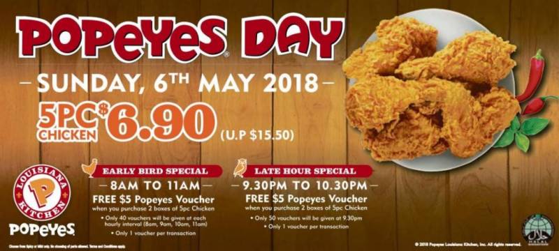 1.Popeyes Day强势来袭,5pc炸鸡只要6块9!还有限时Voucher可以领哦~