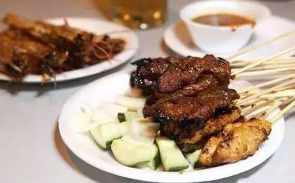 香味四溢的沙嗲是新加坡著名的马来美食,鸡肉串经炭火烧烤之后,搭配马来饭团、切片黄瓜和洋葱,蘸上精心调制的甜辣黄梨花生酱,就是一道美味的马来小吃。