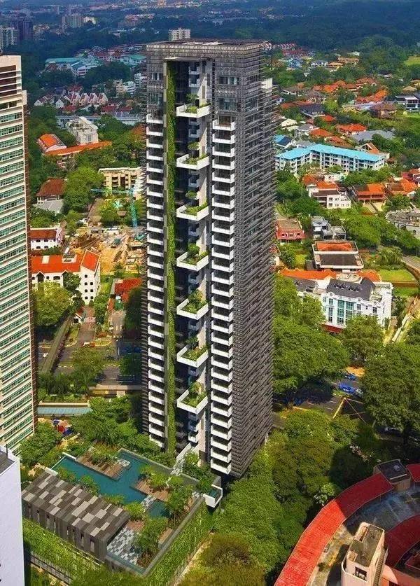 NEWTON SUITES公寓拥有当地最高的常春藤墙,青翠的攀藤植物从底层一路攀到36层,使得绿色面积比占地面积高出30%,是名副其实的绿色建筑。