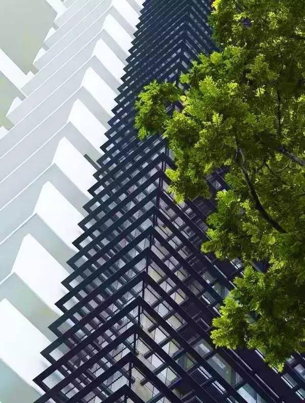 它的另一特色是每四层就有一个绿意盎然的“天空廊道”。其特殊的“抽屉型”廊道搭配抽屉型阳台,让住户无论在哪个楼层都能在绿意中俯瞰市景。