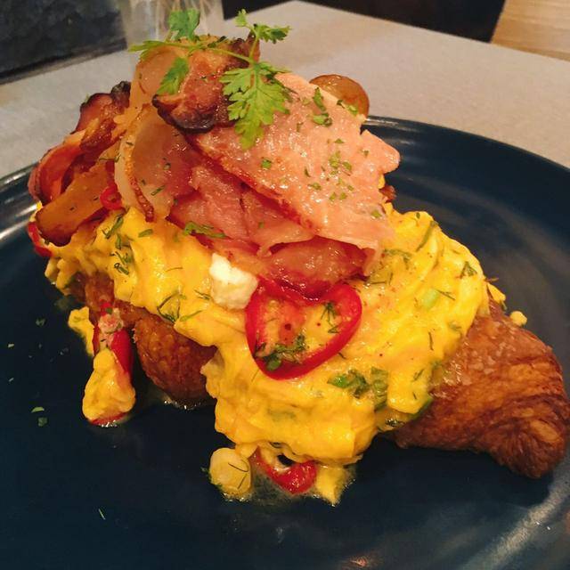 我个人最喜欢牛角包配的滑蛋培根,牛角包好酥脆,一咬嘴角都是掉落的脆皮,滑蛋很滑嫩,真的好吃
