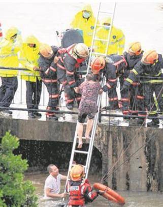 这边水里的人着急,那边岸上一名60多岁的安哥也着急,也没有考虑到自己年纪与体力的问题,马上就跳下水救人,结果自己都被困在排水沟里面。