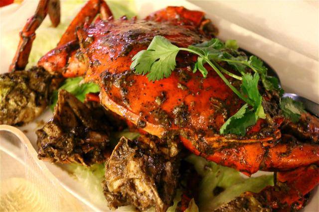 黑胡椒蟹是中餐和西餐相结合的一种创新菜,有炒和烤两种。黑胡椒香料恰如其分地渗入肉中,有新加坡菜典型的口味浓郁的风格。