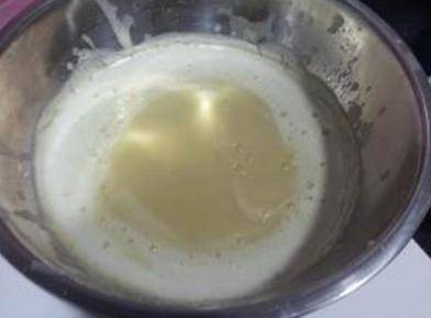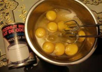鸡蛋加入砂糖用打蛋器慢速打散即可,加入椰浆和香兰叶汁,再搅拌均匀