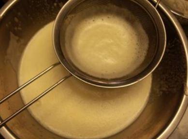 将搅匀的混合物用网兜过滤到另外一个锅或不锈钢碗中,这样熬出来才细滑