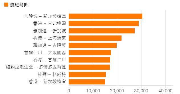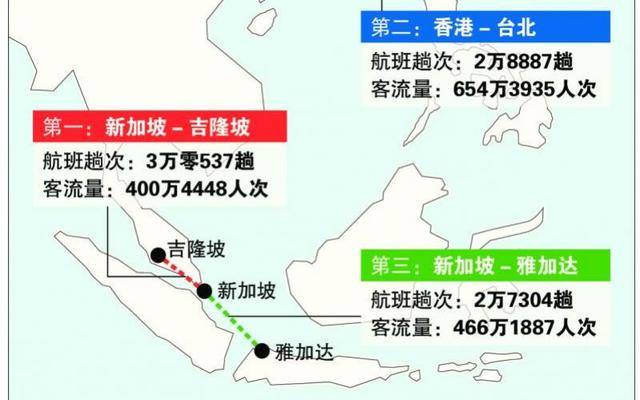 不过,这份报告是以班次排名。从客流量来看,香港至桃园航线共载运654万余人次,樟宜至吉隆坡则是400万余人次。