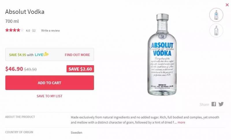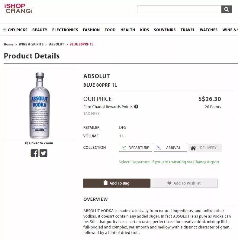 比如普通1升装的Absolut Vodka在ishopchangi卖26.30新,而Redmart上面750ml装的同款则卖到了46.90新!