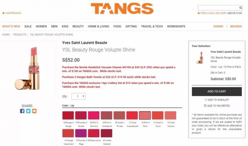 再拿宝宝们都爱的YSL举例,同款YSL ROUGE VOLUPTE SHINE,在ishopchangi卖44新,而市区随便一家店比如Tangs卖52新!(当然遇上比如美罗八折,游客又能退税不要太划算哦!)