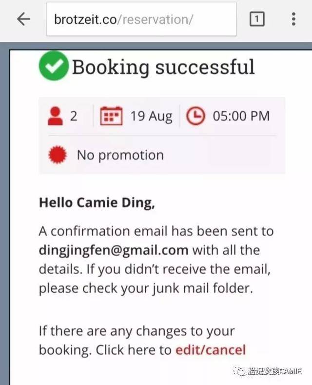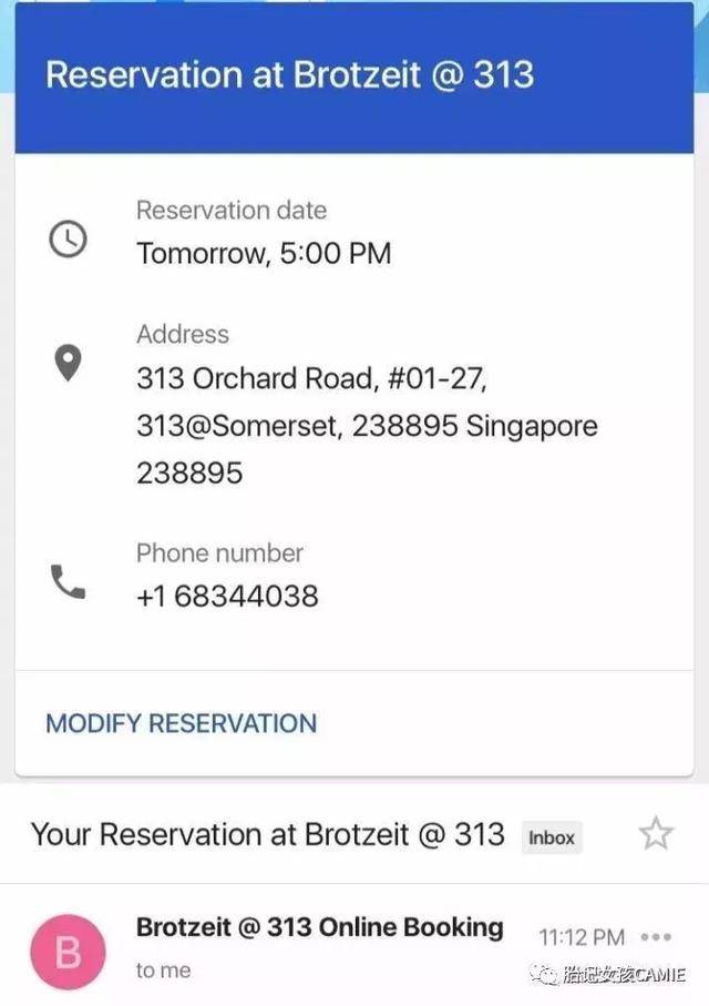 打开邮箱,Brotzeit详细地为你列好了预约时间、餐馆地址以及电话号码 ,如果想更改预约,还可点击下面蓝色的“modify reservation”即可更改预约。