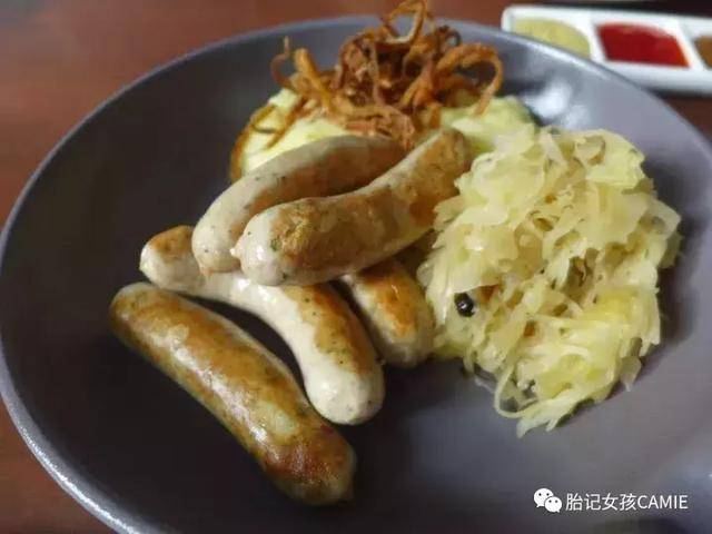 于是我们转战香肠,相比猪蹄,香肠真的太好吃。我一口气吃掉一整根香肠,不过我吃不惯酸卷心菜。再来说说马铃薯泥,香肠配的马铃薯泥和猪腿配的不同,一冷一热,具体哪个冷哪个热我已经不记得了(捂脸),我只记得香肠配的马铃薯泥有奶粉味,口感非常绵密,小孩会很喜欢,而我同行的小伙伴也很喜欢,猪腿配的马铃薯泥就相对普通。