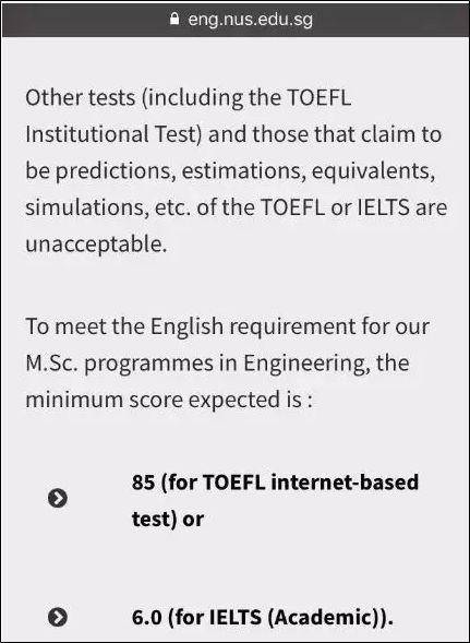 申请新加坡的大学需要证明英语语言水平哦,具体语言要求根据各个大学及专业有所不同,学生们可以去大学网站打探一番。举个例子,新加坡国立大学工程专业硕士就明确要求申请人至少要达到雅思6分;而新加坡南洋理工大学的硕士及博士工程专业则明确要求雅思6.5分。大多数高校要求雅思成绩必须在两年有效期以内。