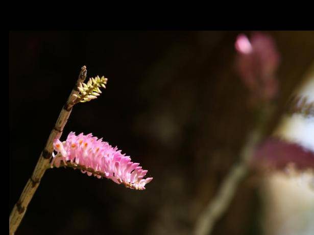俗称牙刷石斛兰,因为它的粉红花朵都聚集在一边,朵朵茂密生长,近看犹如牙刷。这个品种目前已在本地绝迹,公园局是从一些东南亚国家获得种子后,展开繁殖工作,并于去年开始栽种在白沙公园及植物园等地。