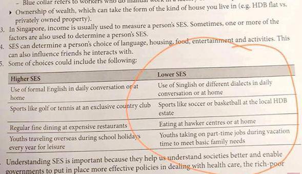 除此之外,这书还写到,经济社会地位“低等”的人一般上会说新式英语、在组屋区踢球或打篮球、在小贩中心或家里吃饭、为了补贴家用而需要打工。