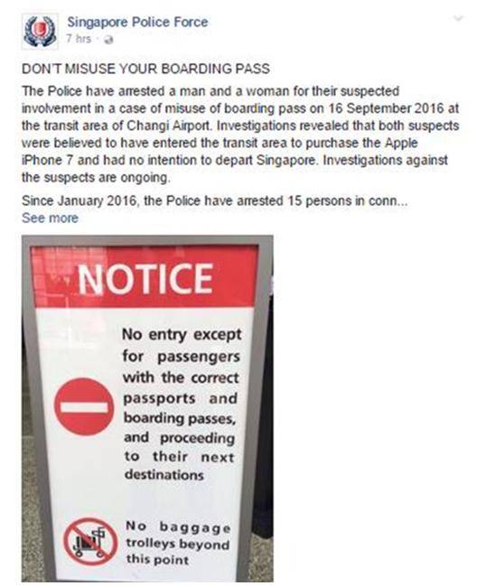 事实上,类似这样的事件在新加坡已经不是罕见的事情了。例如之前iphone7刚刚新出来的时候,就有一男一女为了购买免税的iphone,特意买了机票进入过境区,却没有离境的意思,而警察蜀黎很快就洞悉了他们的意图,随后将他们逮捕了。