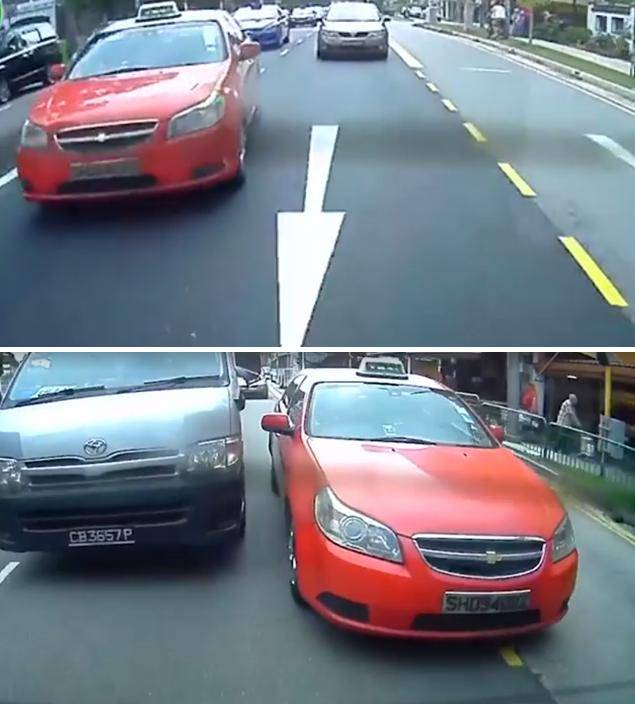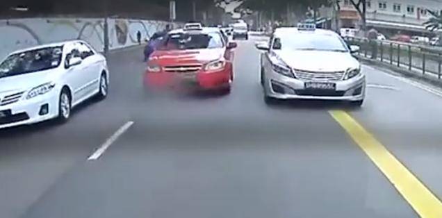 视频中,这辆德士突然从第二条车道改换到第三条车道,然后放慢速度,导致后方的轿车差点撞上。