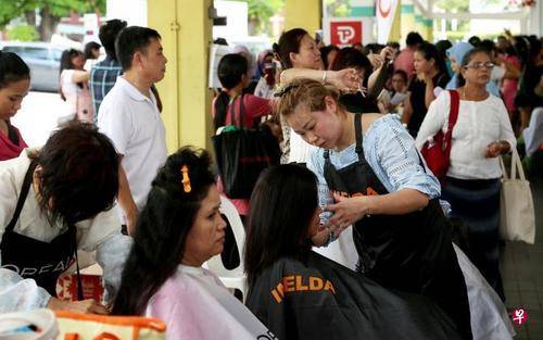 劳动节家庭佣工欢庆会上,义工为外籍帮佣提供免费理发服务。(新加坡《联合早报》/严宣融 摄)