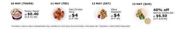 没有会员卡的小伙伴,宜家并没有冷落你们。从10号到13号,每天都有特价美食,而且都是最受欢迎的餐品。4毛钱的酸奶冰淇淋啦,6块5的三文鱼套餐啦……我肯定是要赶在肉丸打折那天去的!