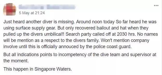 (刚又听说新加坡海域有另一名潜水员失踪。听说他用的是水面供气装备,但是当他们拉起潜水员的潜水胶管时,却只有备用气瓶和帽子!所有迹象都表明当时潜水队和主管能力不足。)
