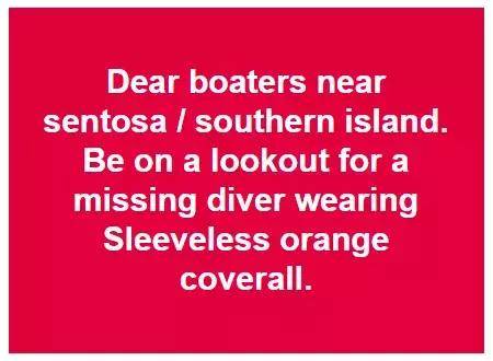 (靠近圣淘沙海域/南部岛屿的船工,请帮忙留意身着橙色无袖工作服的失踪潜水员)