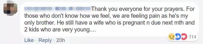 (感谢大家的祈祷。那些不知道我们感受的人,我们真的很心痛,因为他是我唯一的弟弟。他还有一个怀孕的妻子,下个月宝宝就要出生了,还有两个很小的孩子。)