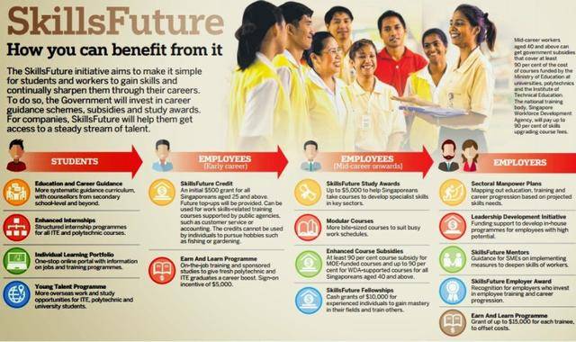 最后呢,新加坡最近几年也在普及这另外一个教育计划,那便是技能创前程(Skills-Future)计划,所谓的该计划就是未来技能培训(SkillsFuture)是一个全国运动,旨在帮助新加坡人终生学习,全面发展个人潜能。未来技能培训让你能够通过不同的学习途径来实现你的愿望及在你喜欢的行业里掌握熟练的技能。这个计划让年满25岁及以上的国人可以继续学习,从而累积技能和知识。如果有任何疑问你可以浏览这里:http://www.skillsfuture.sg/