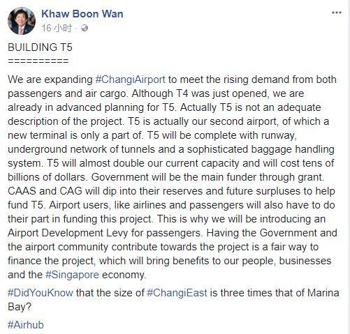 广告基础建设统筹部长兼交通部长许文远在facebook贴文指出,政府扩建樟宜机场是为了应付日益增加的乘客和航空货运需求。