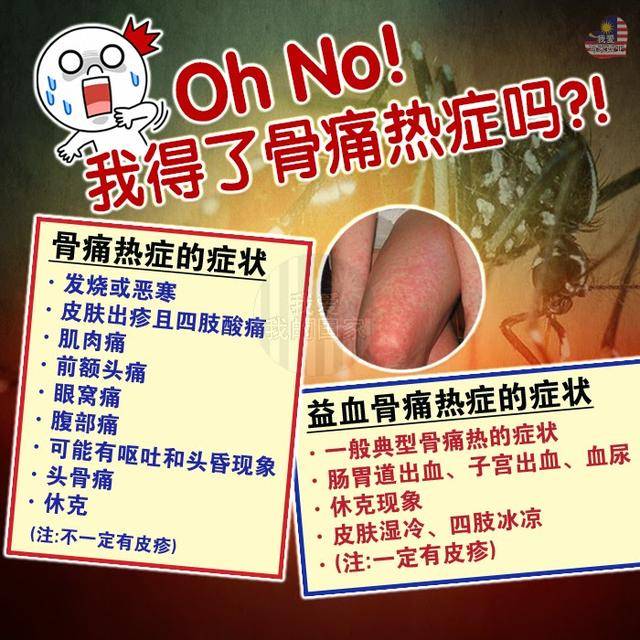 裕廊西91街和92街的12座组屋,是今年最大的骨痛热症病例区,三名居民先后染病去世。值得关注的是,其中一名女病人染病后完全没有出现发烧等骨痛热症的症状,只是曾有胃不舒服的情况。她与家人到槟城旅行时,突然因胃不舒服入院,几天后不治。这种没有出现症状的病情,值得所有人特别留意。传染病医生说,老人家免疫力比较弱,就算感染骨痛热症,也可能不会出现发烧症状。换言之,住在病例区的年长居民应该更留意自己的身体状况变化,轻微不舒服但没有发烧,不代表没有染上骨痛热症,最好还是看医生做详细检查。