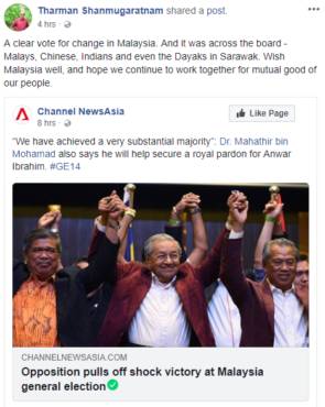 副总理兼经济及社会政策统筹部长尚达曼,今早7时20分就在面书转发马国大选的新闻,并撰文道:“这是为要马来西亚做出改变的清楚投票,而且是横跨各族—马来人、华人、印度人、甚至砂拉越的达雅族人。