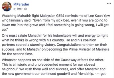 马来西亚发生任何事都会对新加坡带来影响,因为这是新加坡最亲近的邻国历史性和前所未有的事件,希望马哈迪的新政府能继续为新加坡带来善意和友谊。