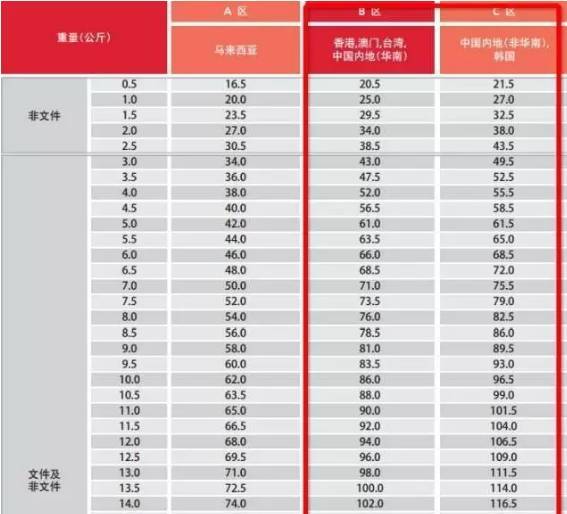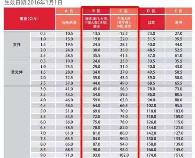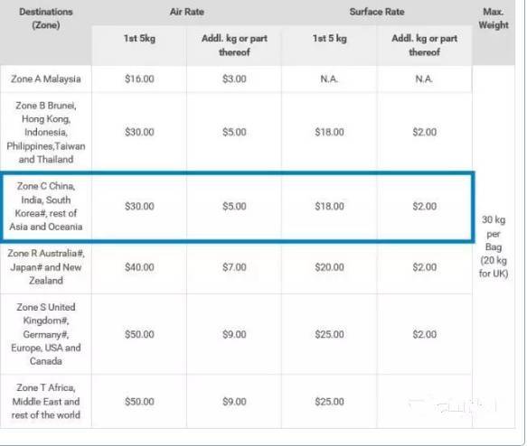 不区分国家和地区,平均到达时间 5-7 周,资费如下图,文件总重量同样不可超过 2kg。