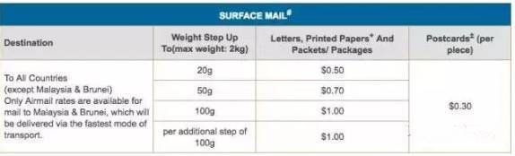 首重 20g 资费是 0.7 新币之后每 10g 补贴 0.25 元新币,文件总重量不能超过 2kg。寄往中国的挂号信件(可追踪路径)需要外加 2.5 新币的挂号费。
