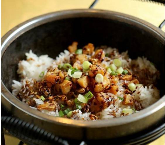“江师傅餐馆” 的石锅饭,就是当年令他回味无穷的猪油渣酱油饭。不同的是,他特别从日本定制石锅盛饭,可保温又能达到砂煲饭的焦香味。