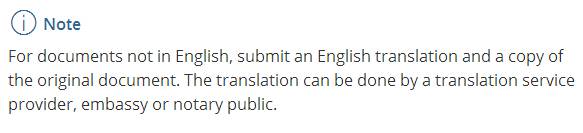我们以EP申请为例。MOM官方网站指出,如果所提交材料是非英文版的,需要提交一份原文件的复印件和翻译件。至于去哪翻译?——人力部不管,你高兴就好。换句话说,不强制公证。