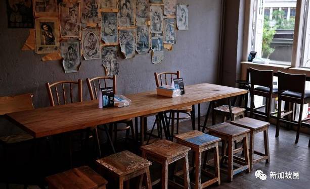 以咖啡店作为主题的鸡尾酒吧墙上挂满旧海报、角落间摆放着旧家具、学校食堂的长桌及木椅,唤起客人的怀旧情怀。
