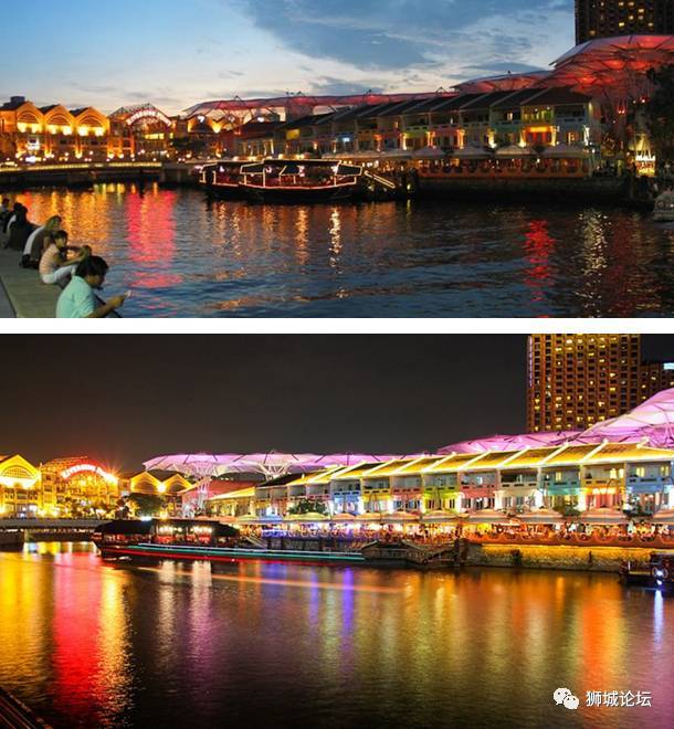 新加坡河对于新加坡来说,是一条非常重要的河流,而新加坡河畔的夜景也十分美丽。这一片是新加坡最早的殖民区和现代CBD区域,拥有全岛最密集的写字楼群。一座座高楼大厦的灯光洒在河面上,河水显得碧波鳞鳞。就连下雨的时候,雨在高楼灯光的照耀下,点点滴滴闪烁著银光。得益于干净的空气,即便是在夜晚,依然可以看到大朵云彩漂浮。新加坡河畔的克拉码头(Clarke Quay)和驳船码头(Boat Quay)聚集著大量的餐厅、酒吧,来到这里以后你会觉得码头似乎整天都处于节庆气氛中,街边的酒吧,餐厅让这里的氛围变得十分欢快轻松。这里是朋友间、情侣两人度过夜晚生活的好地方,也是体验新加坡夜生活的最佳地点。